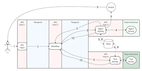 5. Если агенту нужно вызвать модель / инструмент / дочернего агента — он просит ATS, ATS сообщает workflow о необходимости запустить activity (signal/update).