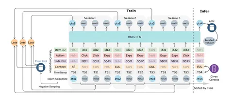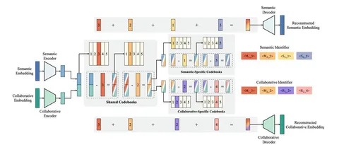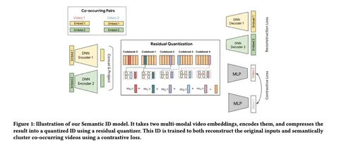 - UA-SID (unified advertisement semantic ID) — единый семантический идентификатор объявления. Объявление прогоняют через мультимодальную модель с instruction tuning для получения эмбеда с учётом прикладной семантики (контент, продукт, рекламодатель и так далее). Потом с помощью co-occurrence learning дообучают эмбеддинги под рекламный домен. Это нужно, чтобы модель лучше улавливала совместимость между рекламными сущностями. Далее полученные эмбеды с помощью MGMR RQ-KMeans квантуют в многоуровневые SID. Первые уровни ловят грубую семантику, следующие — уточняют остаточную информацию. Последний токен — хэш бизнес-ID для борьбы с коллизиями.