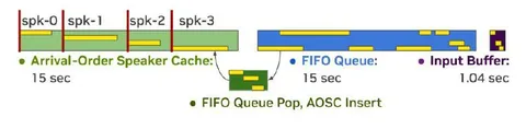 В работе представляют улучшение предыдущей модели Sortformer, в которой были предложены архитектура с Sort Loss и метод выравнивания сегментов диаризации с токенами ASR. Ключевой новинкой стал Arrival-Order Speaker Cache (AOSC) — кэш эмбеддингов спикеров, упорядоченных по времени появления. Модель работает в скользящем окне: в кэш добавляются фреймы с наивысшими оценками уверенности для каждого спикера, с динамическим распределением (минимум K фреймов на спикера и silence embeddings для переходов).