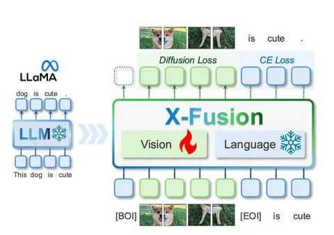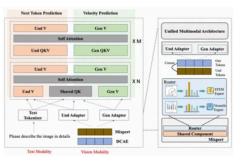 По лоссам всё стандартно: для понимания используют next-token prediction, для генерации — flow matching с velocity prediction.